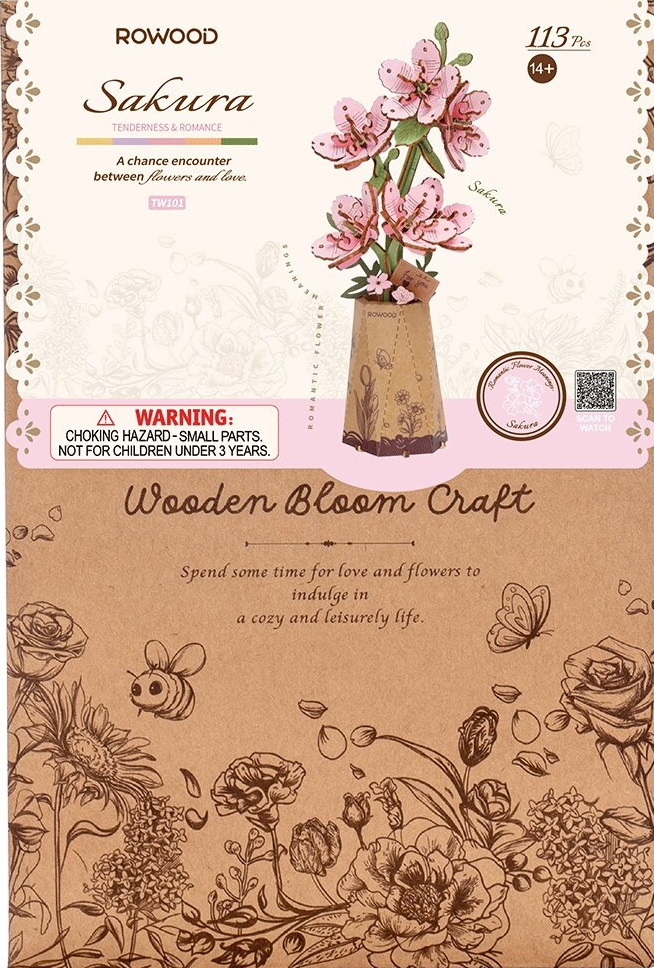 Drewniane puzzle 3D umożliwiające budowę modelu kwiatka Sakury. Zestaw został wykonany z wysokiej jakości sklejki i jest w postaci arkuszy z wstępnie wyciętymi i ponumerowanymi elementami, które przed montażem należy oddzielić od wykroju, a następnie połączyć bez użycia kleju, zgodnie ze szczegółową instrukcją dołączoną do opakowania. Dzięki zastosowaniu nowoczesnej technologii obróbki drewna, Kwiat charakteryzuje oryginalna konstrukcja, a jego budowa będzie ciekawym doświadczeniem.