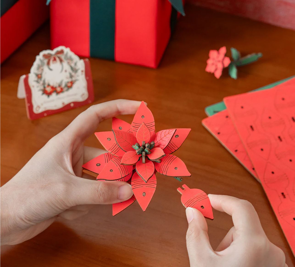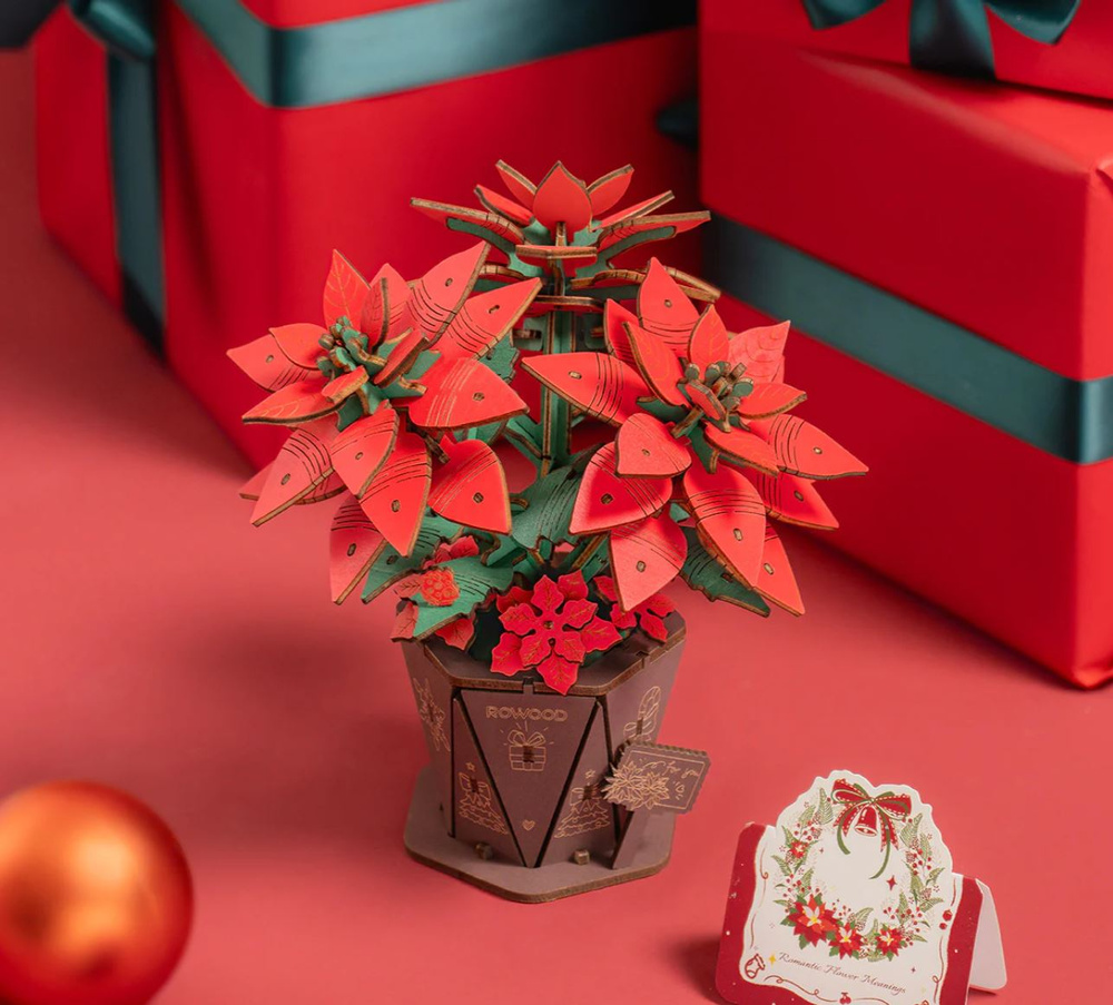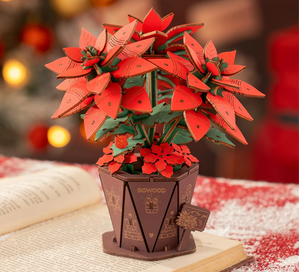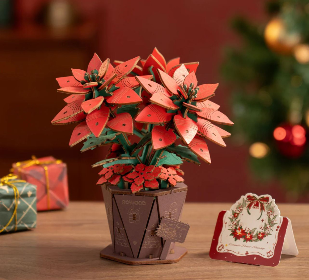 Elegancki model kwiatu poinsecji (gwiazdy betlejemskiej) wykonany z naturalnej, drewnianej sklejki. Precyzyjnie wycięte elementy tworzą dekoracyjną formę inspirowaną świąteczną klasyką. Idealny jako ozdoba bożonarodzeniowa, element aranżacji wnętrza lub kreatywny prezent. Naturalny materiał podkreśla ciepły, rękodzielniczy charakter i pasuje zarówno do nowoczesnych, jak i tradycyjnych wnętrz.