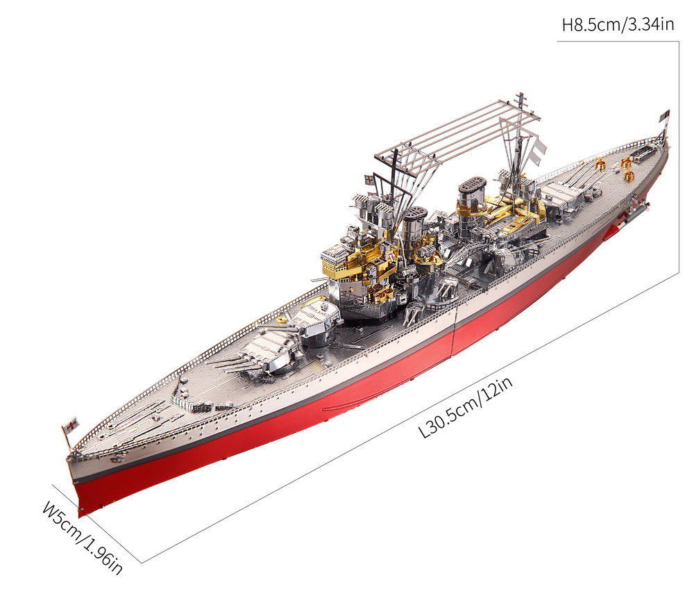 Zbuduj niesamowicie szczegółowy model HMS Prince of Wales za pomocą tego metalowego modelu Piececool. 282 części znajdują się w 3 arkuszach wstępnie barwionego mosiądzu i stali, wraz z 8 akcesoriami uzupełniającymi model.
