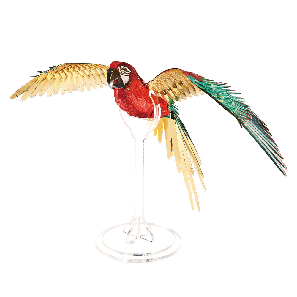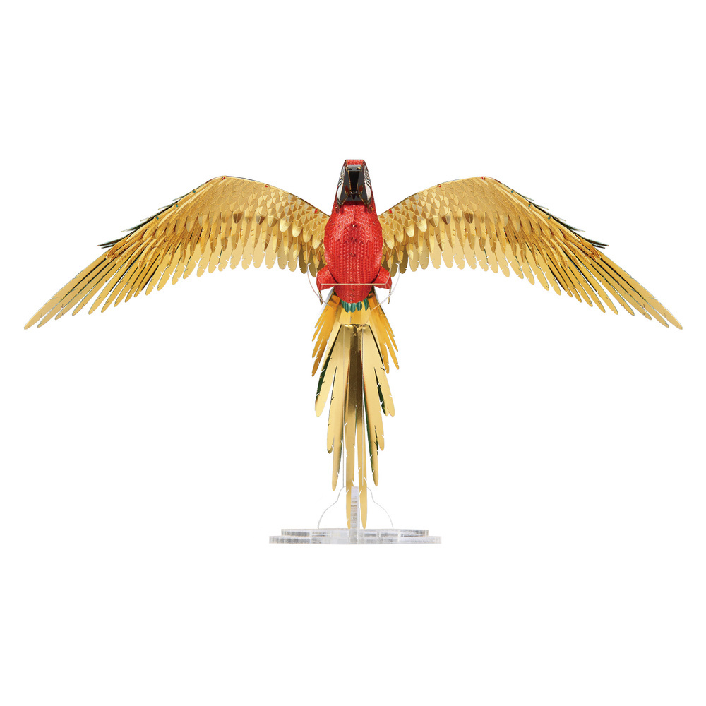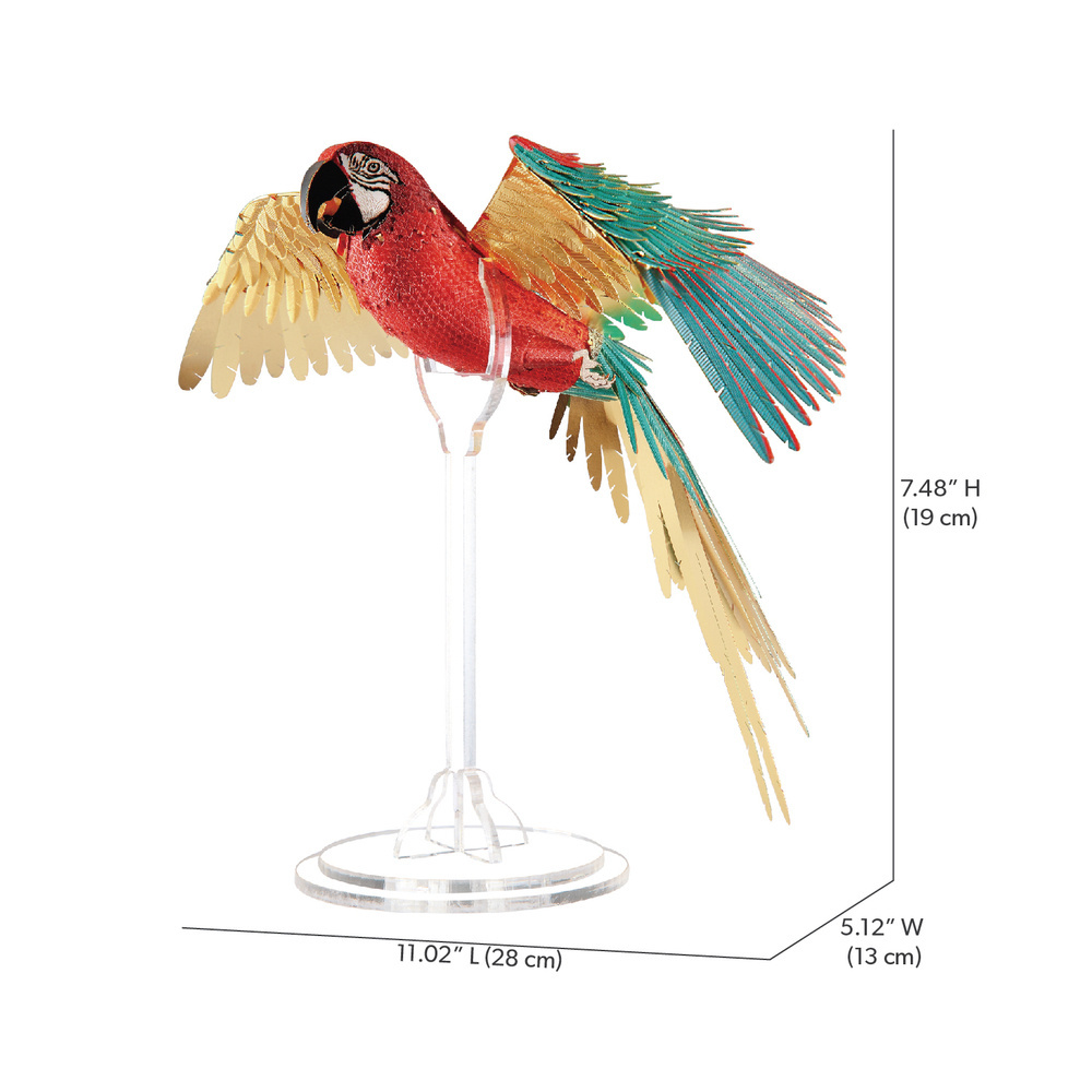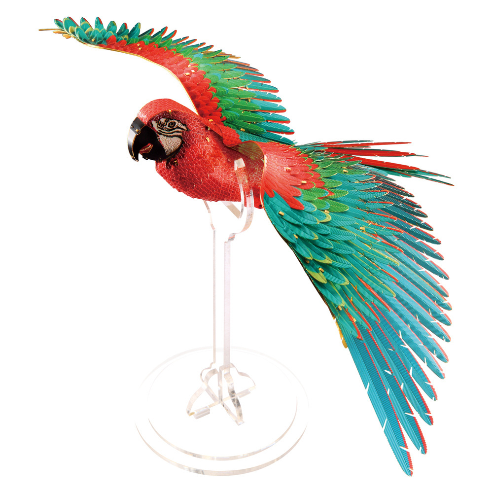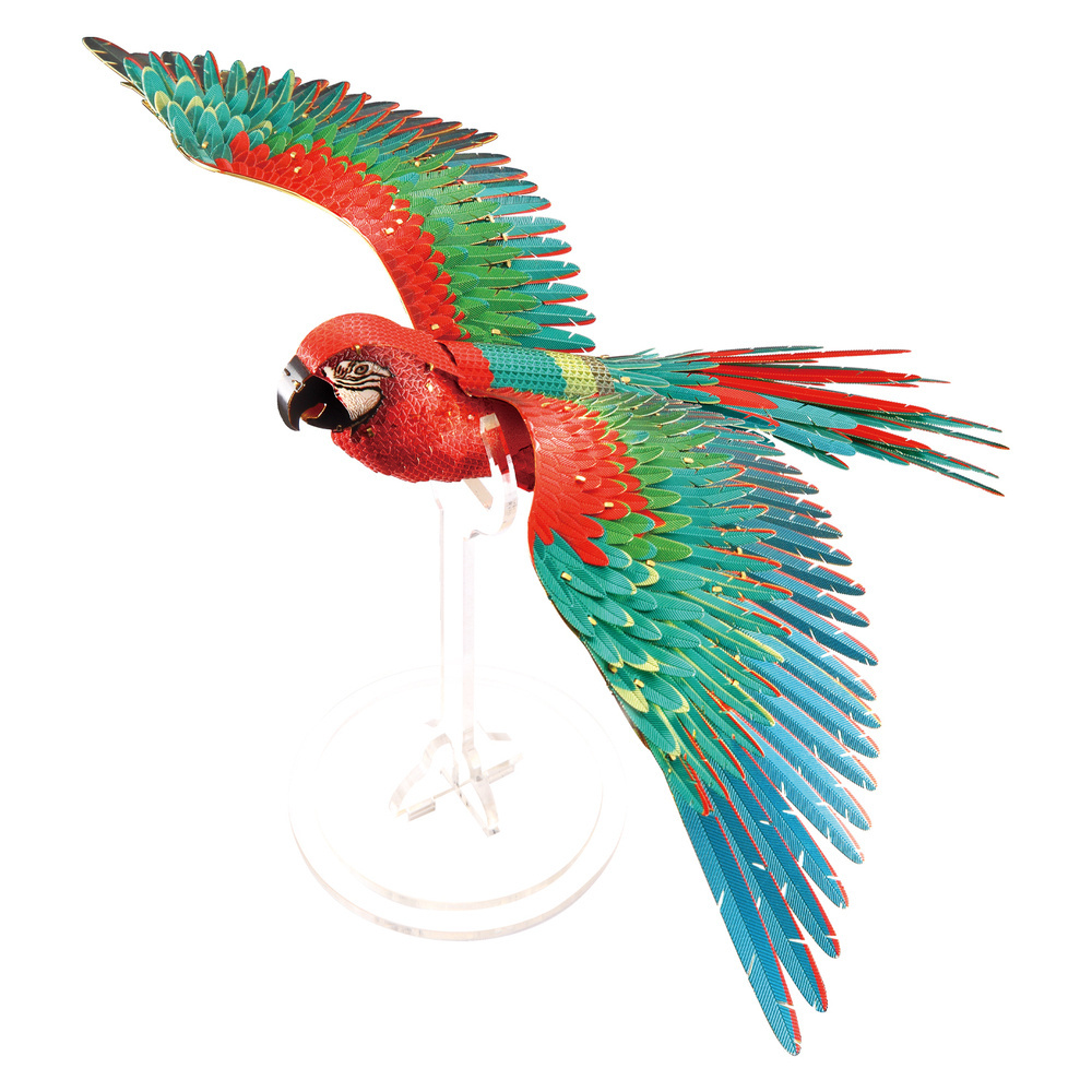 83 mosiężne elementy trawione i drukowane metodą sitodruku są składane zgodnie z instrukcjami krok po kroku, aby stworzyć gotowy model o wymiarach 28 (l) x 13 (szer) x 19 cm (wys.). Przezroczysty akrylowy stojak sprawia, że ptak wydaje się latać po pokoju!